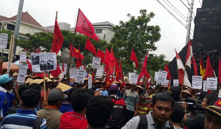 Di sepanjang jalan para petani meneriakkan “darurat agraria”. Mereka juga menuntut pemerintahan Jokowi-JK segera melaksanakan pasal 33 UUD 1945 dan UUPA 1960.