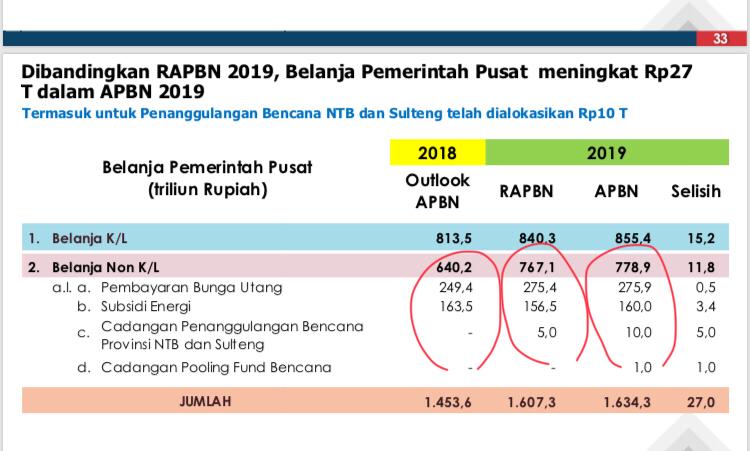 Ambil contoh kolom Outlook 2018. Di sana tersebut Belanja non-KL sebesar Rp 640,2 triliun. Pembayaran bunga utang Rp 249,4 triliun, subsidi energi Rp 163,5 triliun, cadangan penanggulangan bencana NTB Sulteng dan cadangan poling bencana Rp0.