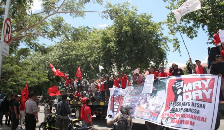 Ratusan buruh dan mahasiswa yang tergabung dalam Front Buruh Sulawesi Tengah menggelar aksi massa untuk memperingati Hari Buruh Sedunia di depan kantor DPRD Palu, Kamis (3/5/2018).