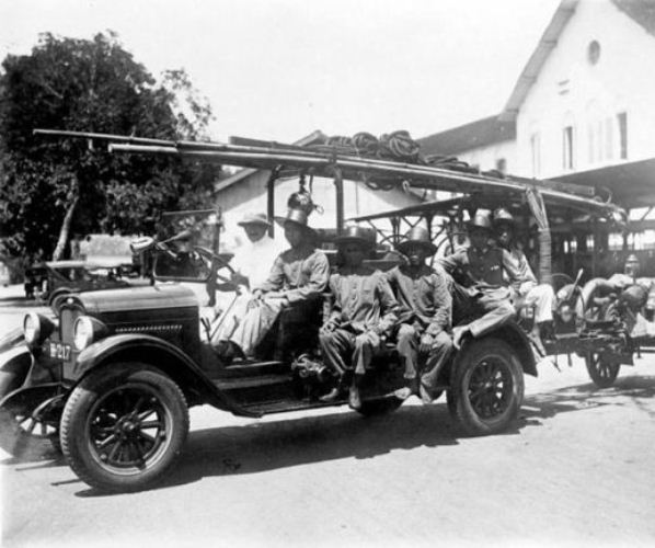 Korp pemada kebakaran jaman itu sudah canggih: sudah menggunakan mobil tangki dan selang. Cuma memang bentuk mobilnya sangat unik: mobil biasa yang membawa tangki biasa pula.