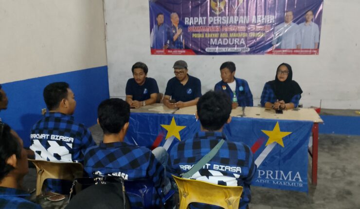 Surabaya, Berdikari Online – Jelang pemungutan suara tanggal 14 Februari 2024, Partai Rakyat Adil Makmur (PRIMA) Jawa Timur terus bekerja memastikan kesiapan mesin politiknya untuk memenangkan pasangan capres-cawapres Prabowo-Gibran. Pada Minggu, 4 Februari 2024 bertempat di Bangkalan, PRIMA Jawa Timur menggelar konsolidasi dengan melibatkan 4 pengurus Dewan Pimpinan Kabupaten Partai Rakyat Adil Makmur (DPK PRIMA) se-Madura Raya (Bangkalan, Sampang, Pamekasan dan Sumenep). Kegiatan ini dipimpin dan dihadiri langsung oleh Ketua DPW PRIMA Jawa Timur Samirin dengan didampingi M. Solikhudin, sekretaris wilayah PRIMA Jawa Timur.