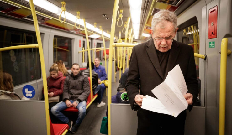 Keterangan foto: Presiden Austria, Alexander van der Bellen, sedang berdiri di atas transportasi umum di kota Wina.