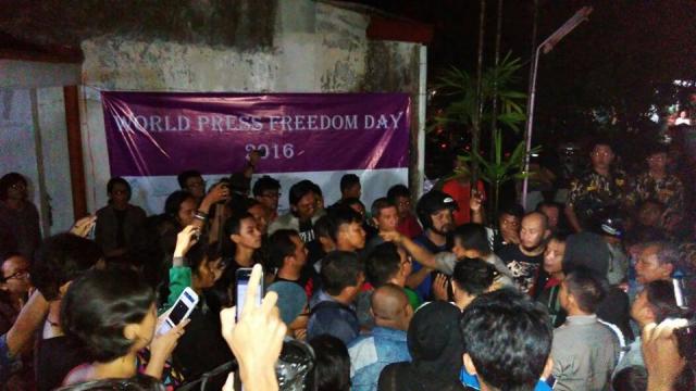 Peringatan Hari Kebebasan Pers atau World Press Freedom 2016, yang disertai dengan pemutaran film Pulau Buru Tanah Air Beta, di kantor Aliansi Jurnalis Independen (AJI) Yogyakarta, Selasa (3/5/2016) malam, dibubarkan paksa oleh aparat kepolisian dan ormas FKPPI.