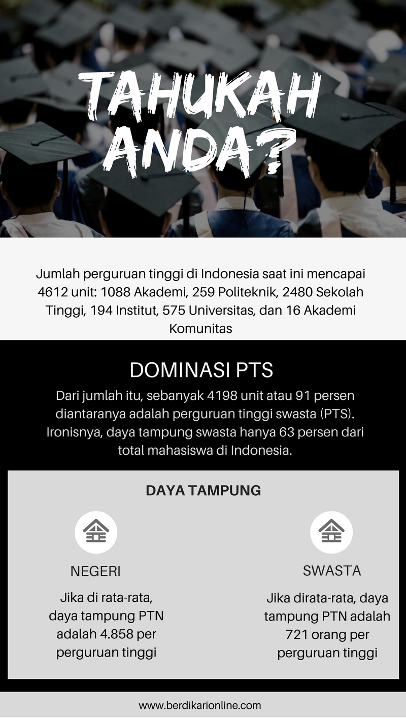 Yang lebih ironis lagi, kendati jumlah perguran tinggi swasta mencapai 91 persen, tetapi daya tampungnya hanya 63 persen dari total mahasiswa di Indonesia. Bandingkan dengan perguruan tinggi negeri, yang jumlahnya hanya 9 persen dari total perguruan tinggi di Indonesia, daya tampungnya 37 persen.