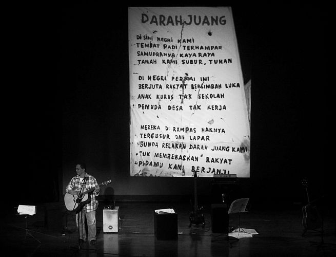 Untuk menyanyikan lagu ini, John tidak memakai band pengiring. Ia menenteng sendiri gitarnya, dan dengan sebuah microphone di hadapannya, ia mulai menyanyikan lagu Darah Juang. Khalayak serentak berdiri dan mengepalkan tangan kiri untuk menyanyikan Darah Juang dengan sangat khidmat.
