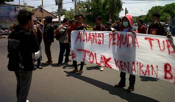 Puluhan mahasiswa dan rakyat miskin yang tergabung dalam Gerakan Nasional Pasal 33 UUD 1945 (GNP 33 UUD 1945) menggelar aksi massa di markas Kepolisian Resort (Mapolres) Tuban, Jumat (28/11/2014).