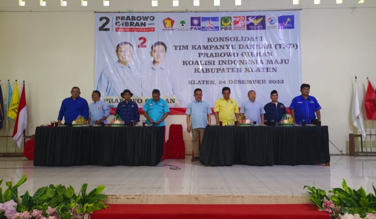 Semarang, Berdikari Online – Koalisi Indonesia Maju (KIM) Kabupaten Klaten bersama Tim Kampanye Daerah (TKD) Jateng, pada Minggu, 24/12/2023 mengadakan konsolidasi pemenangan Calon Presiden dan Wakil Presiden: Prabowo Subianto dan Gibran Rakabuming Raka di Gedung Haji (IPHI) Kecamatan Delanggu. Hadir sembilan partai yang tergabung dalam KIM se-kabupaten Klaten dari pengurus pimpinan daerah hingga pimpinan kecamatan. Massa berjumlah 800 orang memadati gedung dan sangat antusias mengikuti acara dari awal hingga selesai yang dimeriahkan dengan hiburan dari C.R.B musik bersama artis pendukungnya.