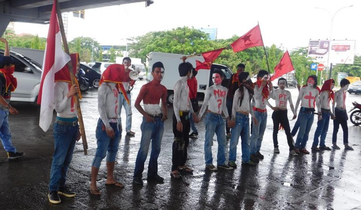 Puluhan mahasiswa yang tergabung dalam Liga Mahasiswa Nasional untuk Demokrasi (LMND) komisariat Universitas Muslim Indonesia (UMI) Makassar, Selasa (15/12/2015), menggelar aksi massa di bawah Jembatan Layang Urip Sumoharjo Makassar.