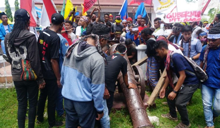 Foto: Massa aksi yang tergabung dalam Aksi Rakyat NTT Menggugat membalikkan meriam peninggalan Belanda yang berada di depan kantor Gubernur NTT, Rabu (28/3/2018); Foto: Tata)