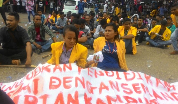 Ratusan mahasiswa dari dua fakultas di Universitas Kristen Artha Wacana (UKAW) Kupang, yakni Fakultas Pertanian dan Fakultas Keguruan dan Ilmu Pendidikan (FKIP), menggelar aksi protes di depan gedung Rektorat UKAW Kupang, Senin (5/2/2018).