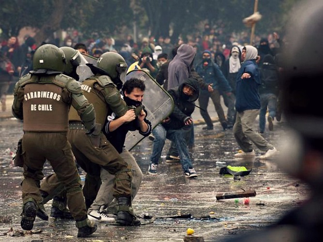 Konfrontasi tak terhindarkan tatkala pemuda bertopeng itu membakar tiga bus kota. Polisi menggunakan alasan ini untuk membubarkan protes damai. Bentrokan pun meluas di jalan-jalan utama kota Santiago.