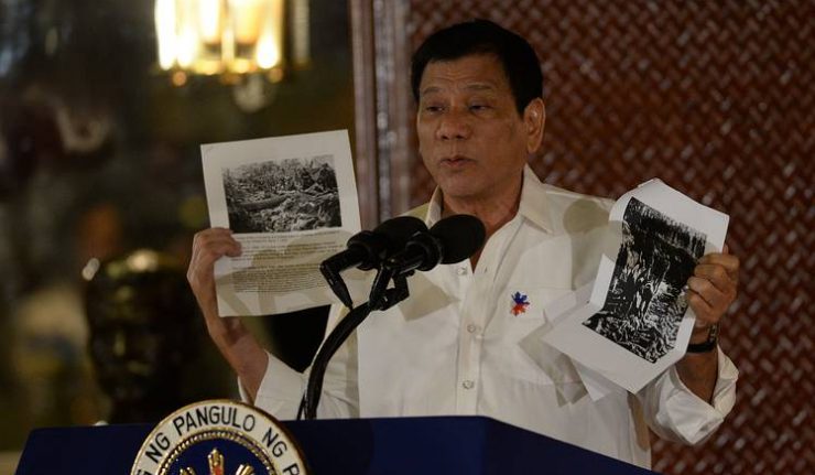 Saat memberi pernyataan, mantan Walikota Davao itu juga menunjukkan sejumlah foto yang memperlihatkan pasukan AS membantai warga muslim selama awal 1900-an.