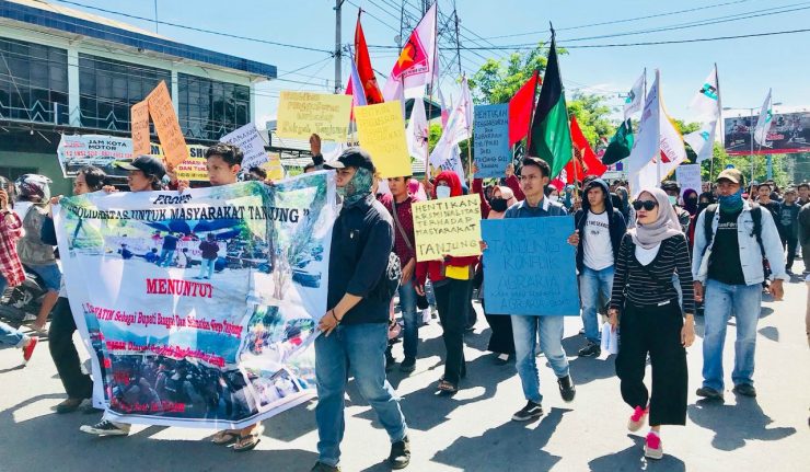 Ratusan aktivis yang tergabung dalam Front Solidaritas untuk Masyarakat Tanjung mengecam penggusuran paksa terhadap warga Tanjung Sari, kecamatan Luwuk, Kabupaten Banggai, pada 19 Maret 2018.