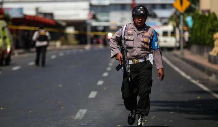 Keterangan foto: Anggota kepolisian berjaga disekitar wilayah Mapolrestabes Surabaya, Jawa Timur, Senin (14/5/2018) pasca serangan bom.(KOMPAS.com/GARRY ANDREW LOTULUNG)