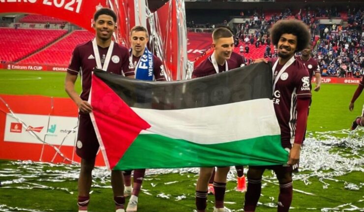 Dua pemain Leicester, Hamza Choudhury dan Wesley Fofana, berjalan di pinggir lapangan sambil membentangkan bendera Palestina. Bahkan, ketika Choudhury mengambil piala, bendera itu masih membalut pundaknya.
