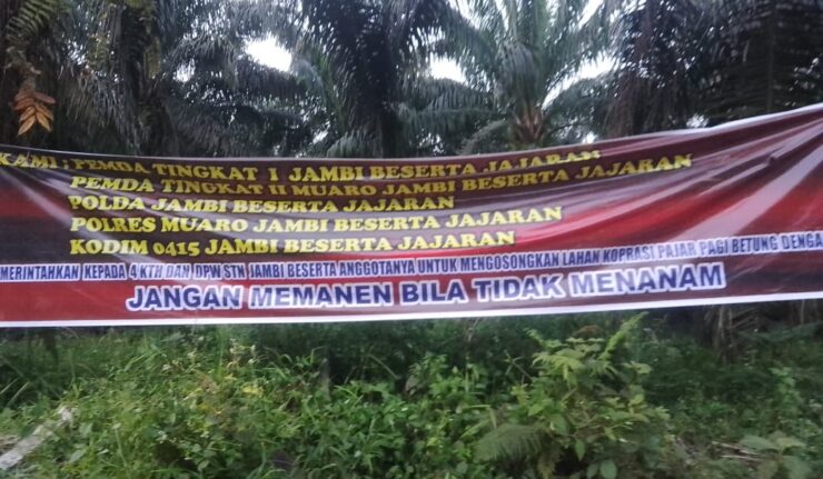 Jambi, Berdikari Online – Sabtu, 14 Oktober 2023 Desa Betung, 4 Kelompok Tani Hutan (KTH) yang sedang mengajukan Perhutanan Sosial dan pengelolaan objek dalam Kawasan Hutan Eks PT Ricky Kurniawan Kertapersada (RKK) yang dibebani izin PT Wirakarya Sakti (WKS) dikagetkan dengan spanduk yang dipasang oleh oknum anggota Koperasi Fajar Pagi. Spanduk itu berisi perintah pengosongan lahan yang dikeluarkan Pemerintah Provinsi Jambi, Pemerintah Kabupaten Muaro Jambi, Polda Jambi, Polres Jambi sampai dengan Kodim 0415 Gapu.