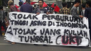 Sedikitnya 50-an mahasiswa yang tergabung dalam Liga Mahasiswa Nasional untuk Demokrasi (LMND) menggelar aksi di depan kantor Kemenristekdikti,...
