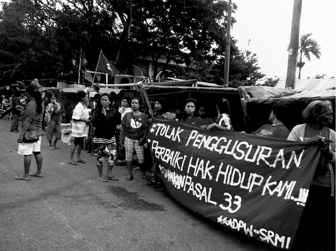 Seratusan massa aksi yang tergabung dalam Serikat Rakyat Miskin Indonesia (SRMI) menggelar aksi massa menolak pembongkaran kios pedagang...