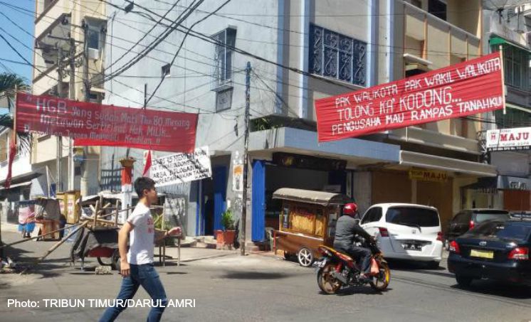 Spanduk itu, antara lain, bertuliskan: “Pak Walikota dan Pak Wakil Walikota, tolong ka’ kodong. Pengusaha mau rampas tanahku”. Ada juga spanduk bertuliskan “HGB yang sudah mati tahun 80 menang melawan sertifikat hak milik. Pengadilan jangan mengadili keadilan.”