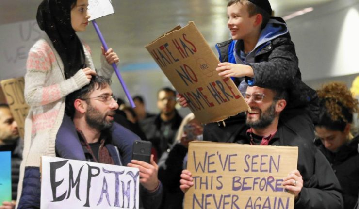 Minggu lalu, saya bergabung dengan puluhan ribu orang yang memprotes perintah eksekutif Presideh Donald Trump yang melarang pengungsi dan warga negara dari tujuh negara mayoritas muslim memasuki Amerika Serikat. Aku kagum karena melihat banyak Yahudi—orang-orang yang mendengar cerita keluarganya bahwa mereka dilindungi oleh Muslim selama holocaust—bergabung dalam aksi protes. Ini adalah orang-orang Yahudi, yang kakek-neneknya diizinkan tinggal di Amerika Serikat setelah melarikan diri dari pembantaian ‘Third Reich’—kisah-kisah yang sebetulnya personal tetapi membuat mereka berdiri untuk membela kaum yang tertindas hari ini. Cerita ini hadir di setiap jantung komunitas yang berdiri membela kebebasan sipil.